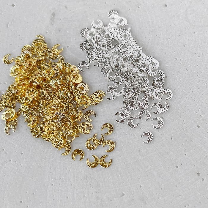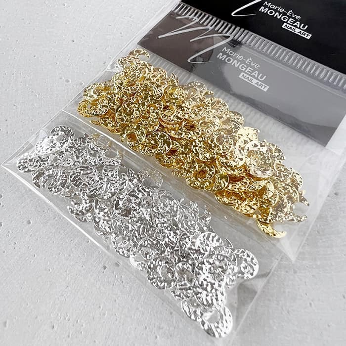 Voici de belles lunes plane et ciselées Or en métal pour façonner vos poses bijoux d’ongles. Ces lunes peuvent être ajustées à la courbure de l’ongle, car elles se plient. Soit avec un outil qui courbe les bijoux ou avec vos pinces et vos doigts.
