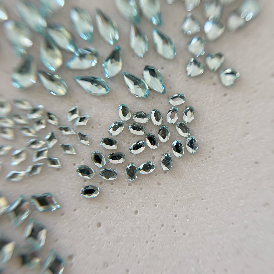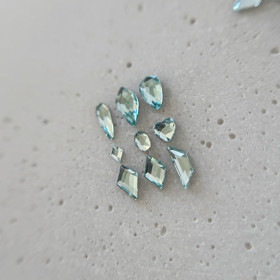 Diamants  Formes Maldives bleu lagon translucide aux reflets cristallins, inspiré des eaux des Maldives. Sa teinte fraîche oscille entre le bleu aqua et le vert d’eau, offrant un effet à la fois lumineux, pur et ultra raffiné.