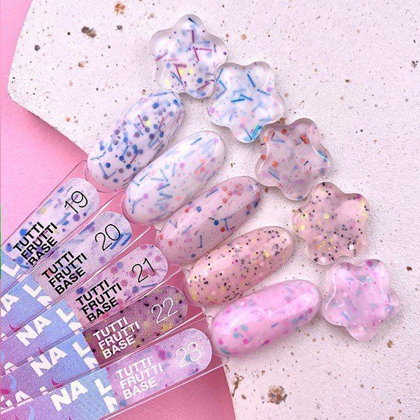 Tutti Frutti Base 01 est une base de camouflage avec des éléments colorés pastel pour recouvrir et niveler les ongles.