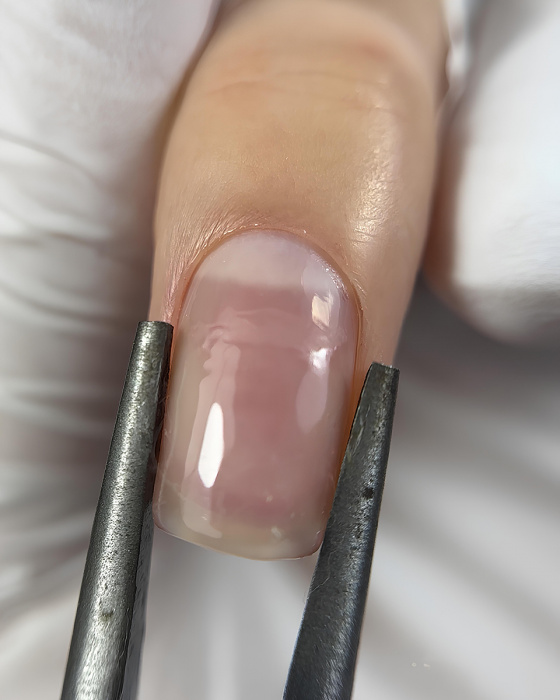 Si vous effectuez un renforcement, veillez à limer l'ongle naturel par dessous sur une longueur d'au moins 1 mm pour éviter les éclats au bord libre.